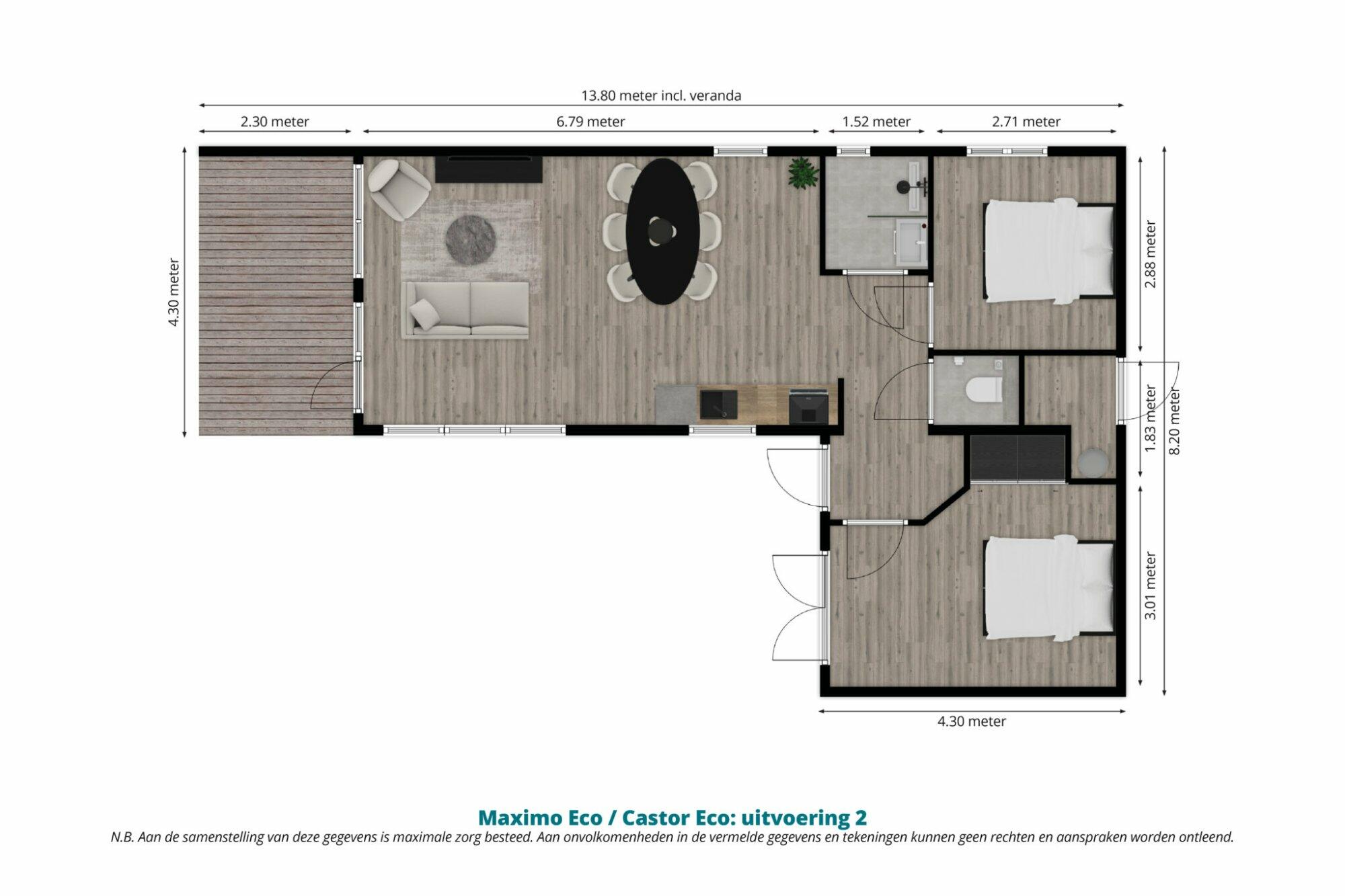 Afmetingen (lxb): 13.80 x 4.30 + 4.30 x 3.90 incl. veranda