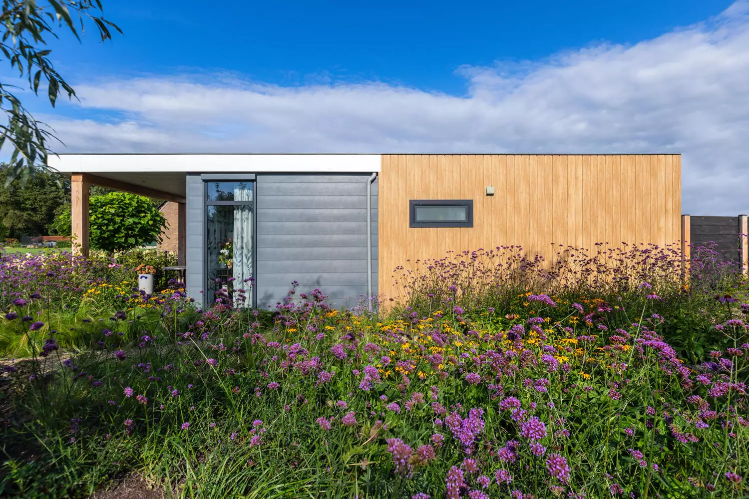 - Modern chalet met veranda en veel lichtinval door de openslaande deuren in de woonkamer.
