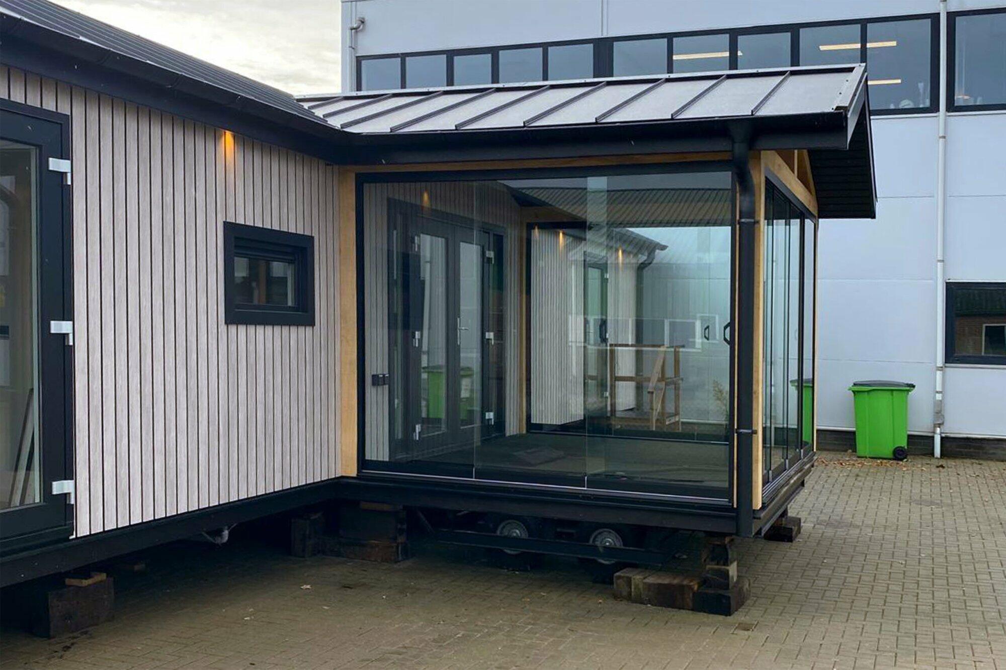 - Chalet met een zadeldak van moderne felsplaten voorzien van grote pui met openslaande deur in de woonkamer.