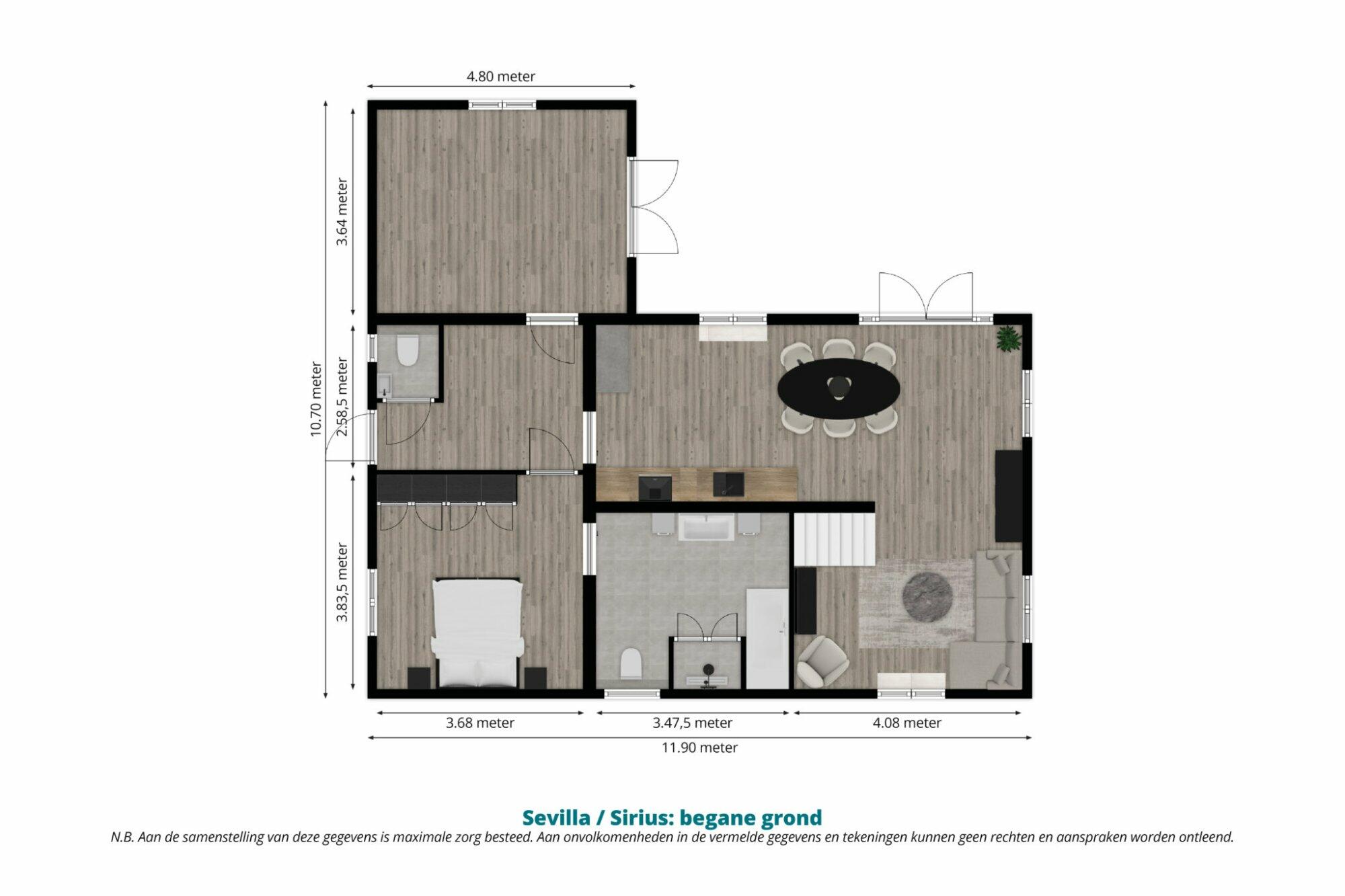 Beneden: 11.90 x 6.85 + 4.80 x 3.85 meter. Oppervlakte 100 m²
