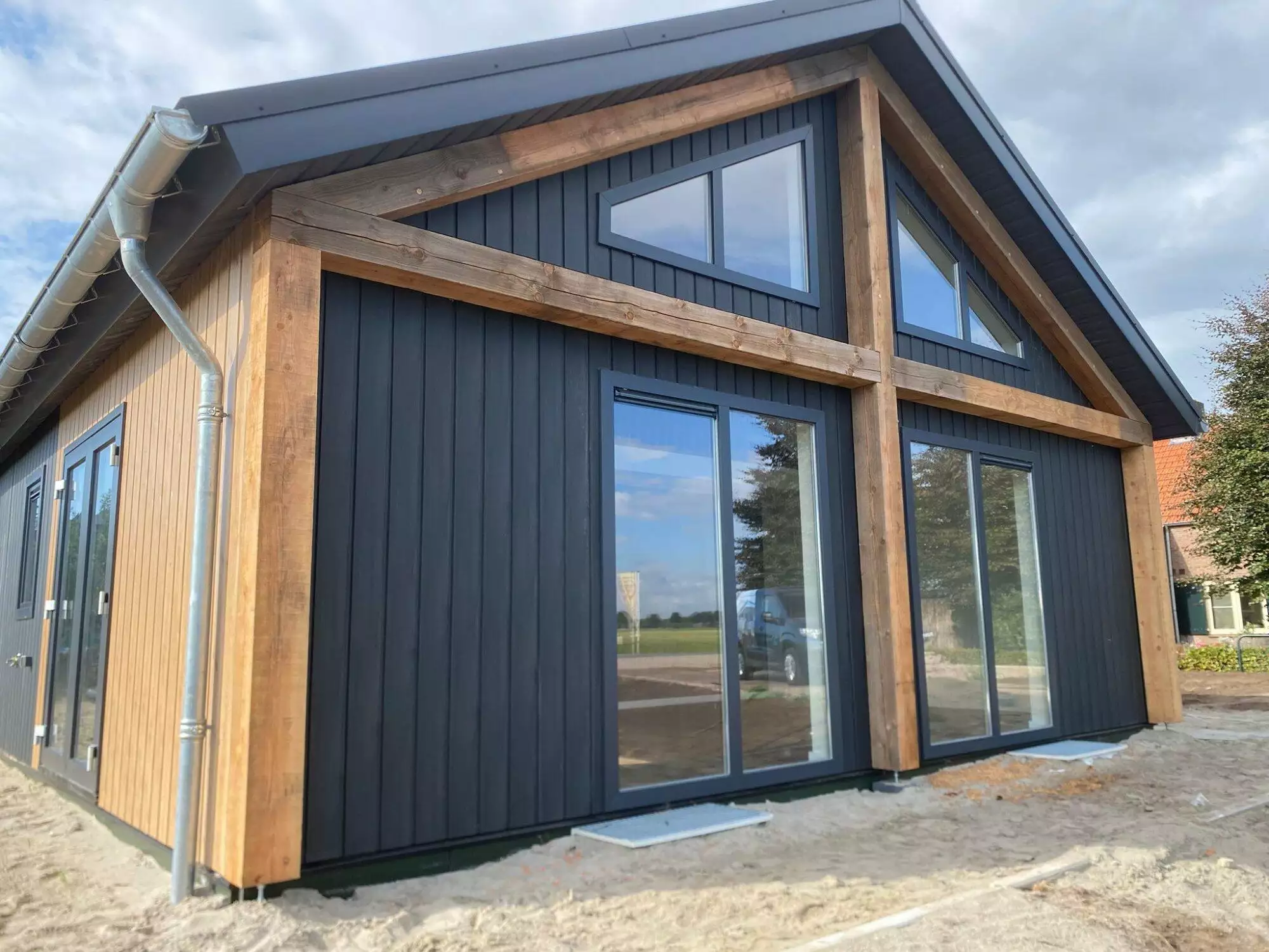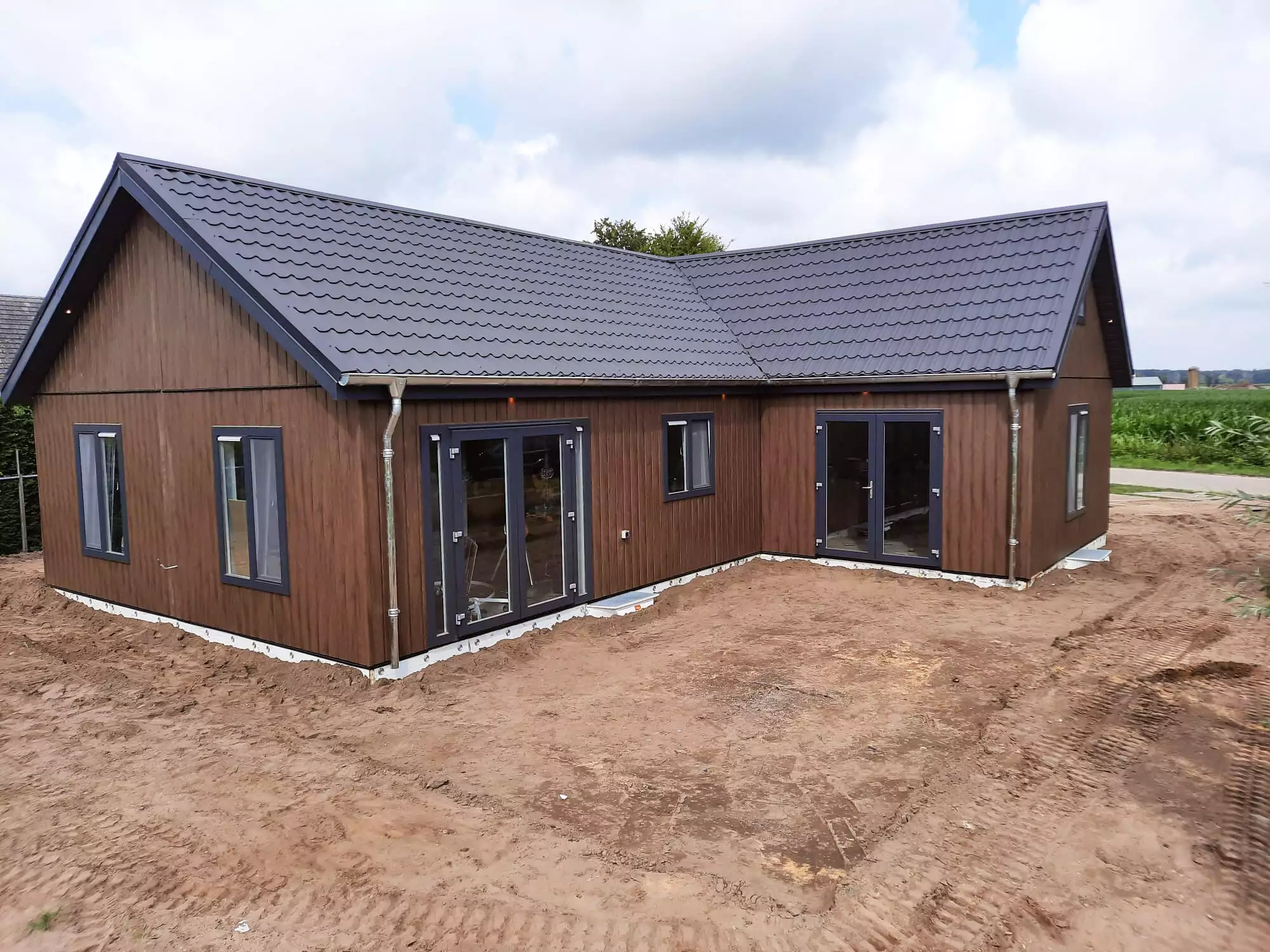 - Zeer ruime prefab woning bestaande uit 2 lagen met vide en openslaande deuren in de woonkamer.